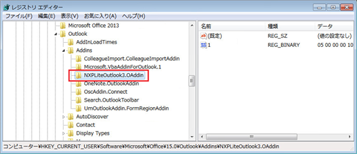 - [HKEY_CURRENT_USER\Software\Microsoft\Office\Outlook\Addins]を開き、[NXPLite*3.OAddin]を削除します。(*3には対象のOfficeアプリケーション名と数字が入ります)